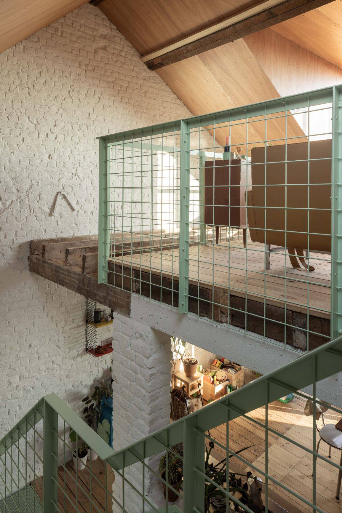 Ce projet de transformation des trois derniers étages d’une maison Bruxelloise en appartement restructure les niveaux et les vues par le déplacement de la circulation verticale. L'escalier d'origine, qui longeait le mur mitoyen, est conservé uniquement pour l'accès au logement. Un nouvel escalier, réalisé en métal vert sauge par les artisans de Stylmétal, prend le relais. Il s'insère au centre de l'appartement, parallèlement aux façades, et devient un élément structurant de l'intérieur qui se juxtapose à l’existant.